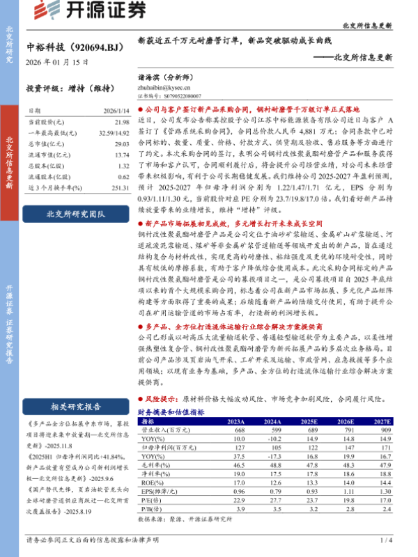 【开源证券】【202601】中裕科技(920694.BJ)北交所信息更新:新获近五千万元耐磨管订单,新品突破驱动成长曲线-4页 证券期货研究报告