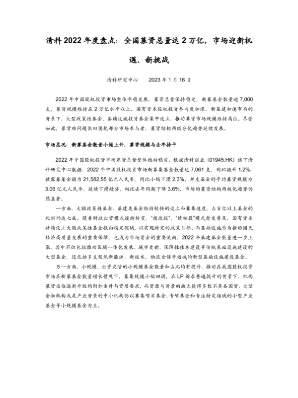【清科研究中心】【20230116】2023-01-18-清科2022年度盘点:全国募资总量达2万亿,市场迎新机遇、新挑战-14页 行业研究