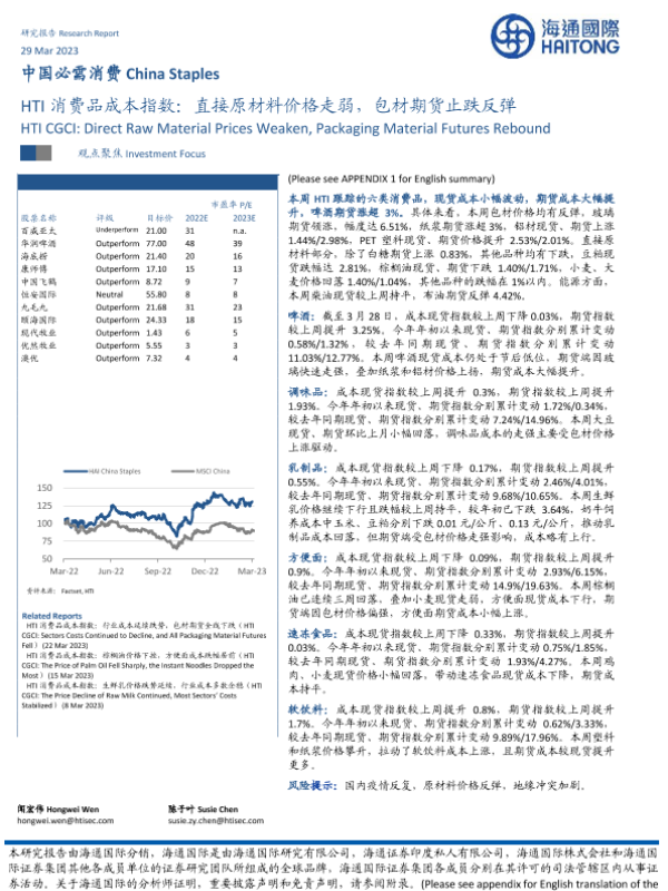 【海通国际】【20230329】中国必需消费行业:HTI消费品成本指数,直接原材料价格走弱,包材期货止跌反弹-16页 行业研究