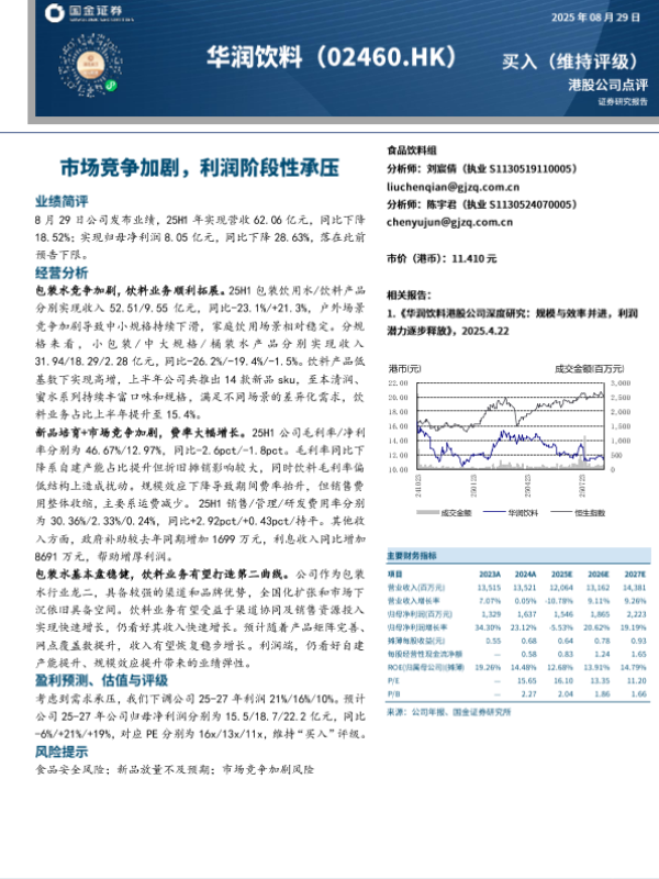【刘盛倩(执业S1130519110005)陈宇君(执业S1130524070005)】【20250829】华润饮料-市场竞争加剧_利润阶段性承压-4页 证券期货研究报告