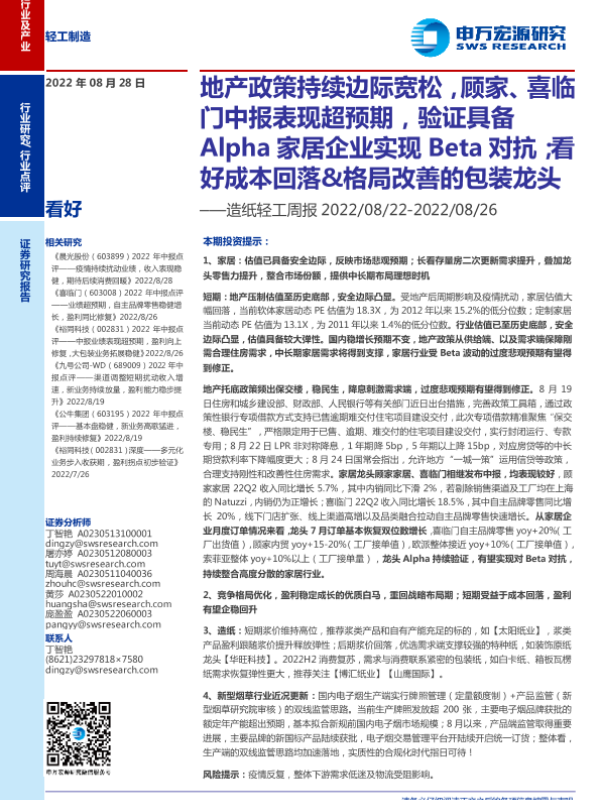 【申万宏源】【20220828】纸轻工行业周报:地产政策持续边际宽松,顾家、喜临门中报表现超预期,验证具备Alpha家居企业实现Beta对抗;看好成本回落&格局改善的包装龙头-27页 行业研究