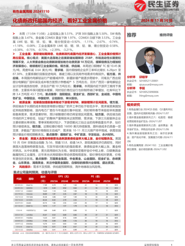 【民生证券】【20241110】20241110-民生证券-有色金属周报:化债新政托底国内经济,看好工业金属价格-29页 行业研究