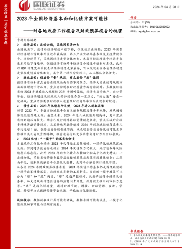 【国联证券】【20240408】对各地政府工作报告及财政预算报告的梳理:2023年全国经济基本面和化债方案可能性-17页 行业研究