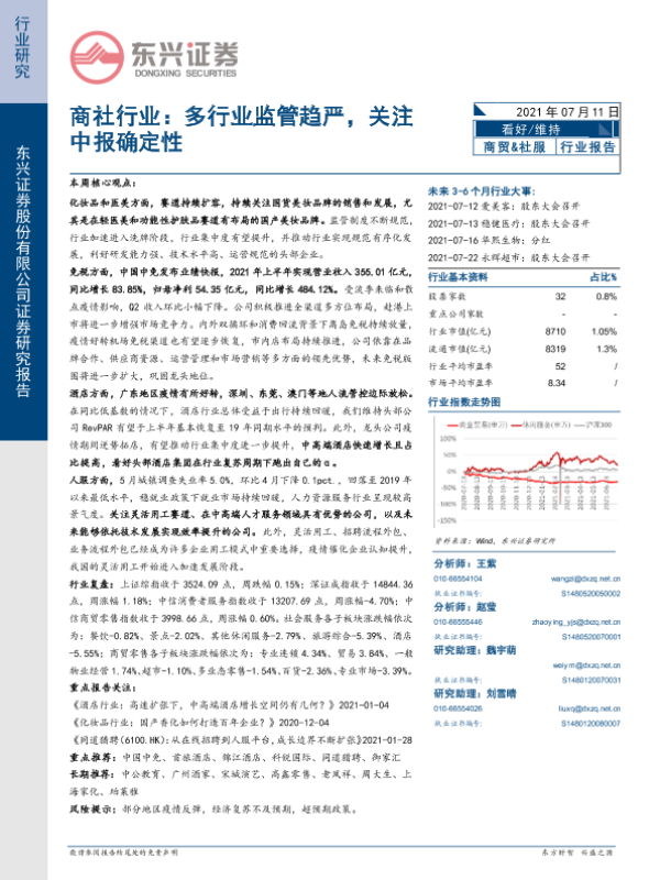 【东兴证券】【20210711】多行业监管趋严,关注中报确定性-9页 行业研究