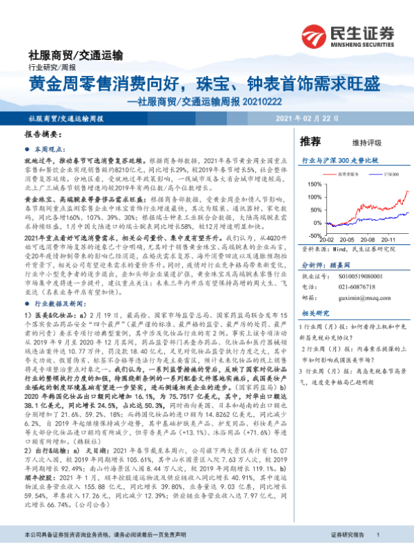 【民生证券】【20210222】社服商贸 交通运输周报:黄金周零售消费向好,珠宝、钟表首饰需求旺盛-11页 行业研究