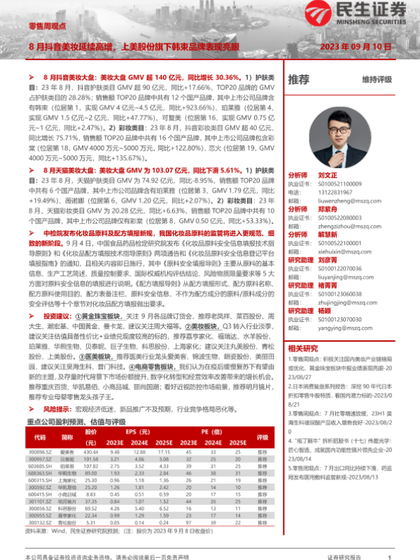 【民生证券】【20230910】8月抖音美妆延续高增,上美股份旗下韩束品牌表现亮眼-19页 行业研究