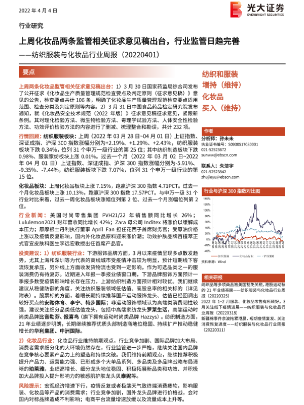 【光大证券】【20220404】20220404-光大证券-纺织服装与化妆品行业周报:上周化妆品两条监管相关征求意见稿出台,行业监管日趋完善-11页 行业研究