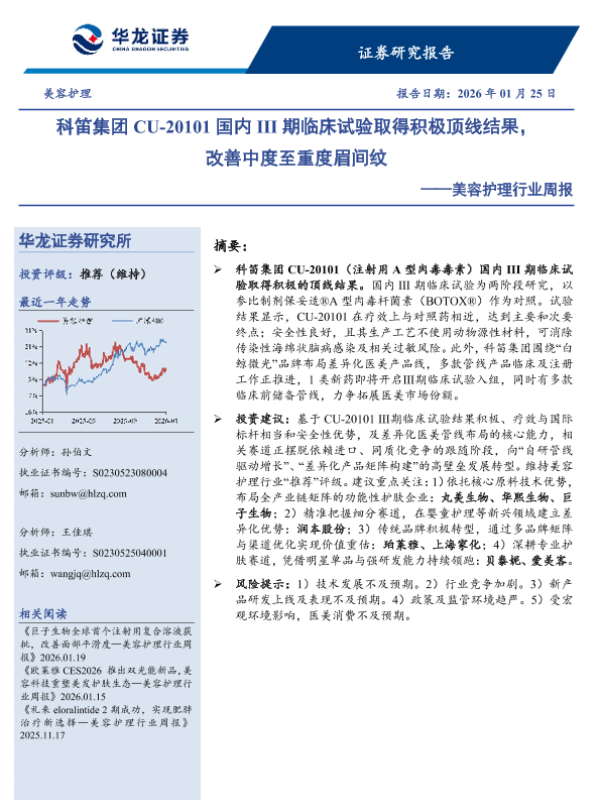 【华龙证券】【202601】科笛集团CU-20101国内III期临床试验取得积极顶线结果,改善中度至重度眉间纹-9页 证券期货研究报告