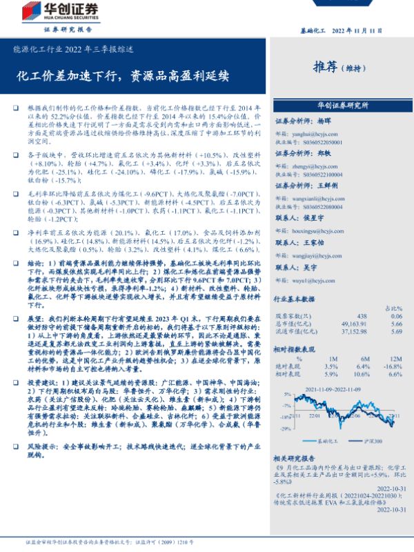【华创证券】【20221111】能源化工行业2022年三季报综述:化工价差加速下行,资源品高盈利延续-52页 行业研究
