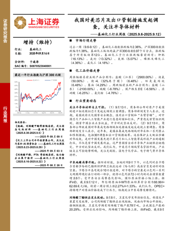 【上海证券】【202509】我国对美芯片及出口管制措施发起调查,关注半导体材料——基础化工行业周报(2025.9.6-2025.9.12)-10页 证券期货研究报告