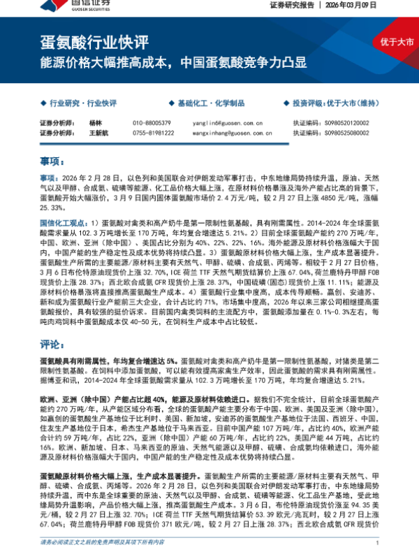 【国信证券】【202603】蛋氨酸行业快评:能源价格大幅推高成本,中国蛋氨酸竞争力凸显-5页 证券期货研究报告