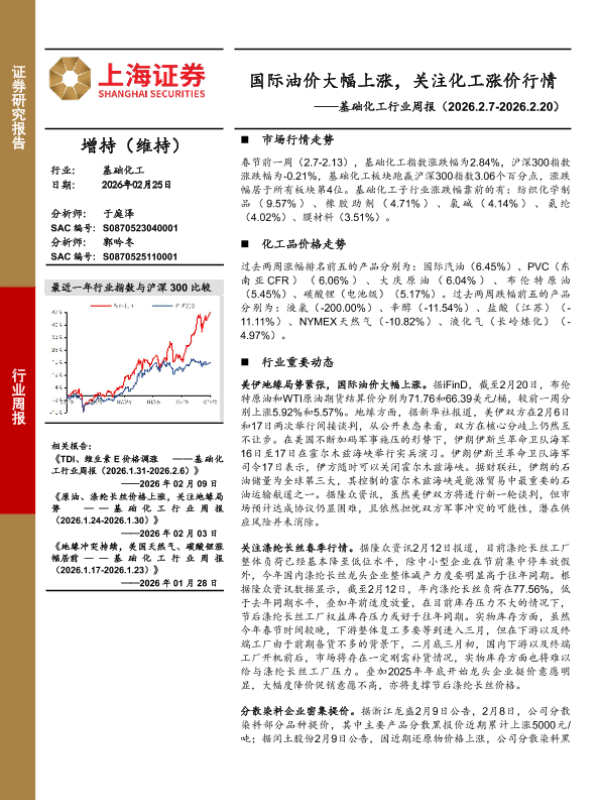 【上海证券】【202602】基础化工行业周报:国际油价大幅上涨,关注化工涨价行情-10页 证券期货研究报告