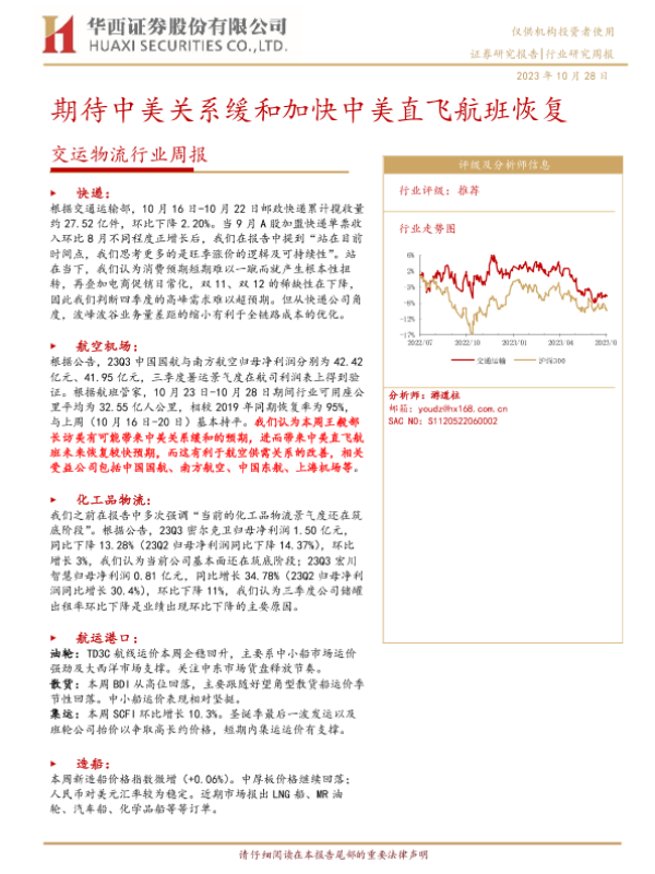 【华西证券】【20231028】交运物流行业周报:期待中美关系缓和加快中美直飞航班恢复-20页 行业研究