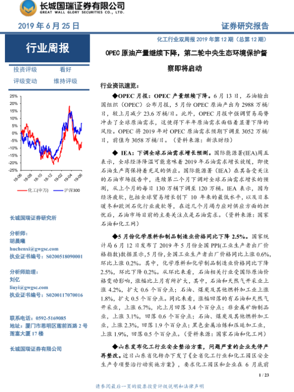 【长城国瑞证券】【20190625】化工行业双周报2019年第12期(总第12期):OPEC原油产量继续下降,第二轮中央生态环境保护督察即将启动-23页 行业研究