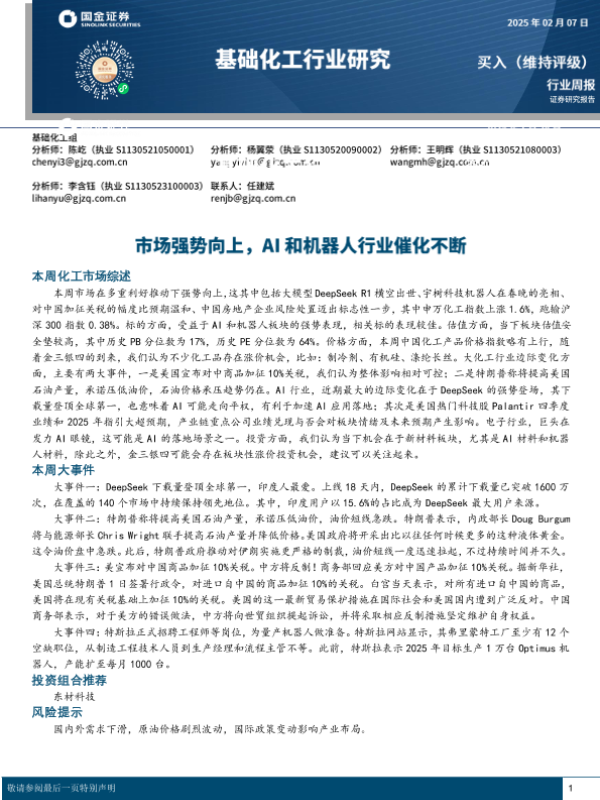 【国金证券】【20250207】基础化工行业研究:市场强势向上,AI和机器人行业催化不断-23页 行业研究