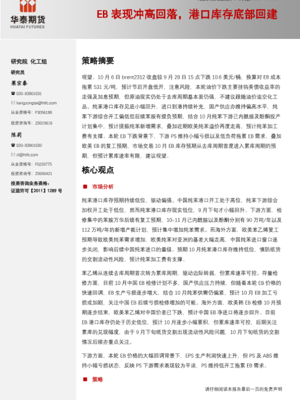 【华泰期货】【20231008】EB月报:EB表现冲高回落,港口库存底部回建-15页 行业研究