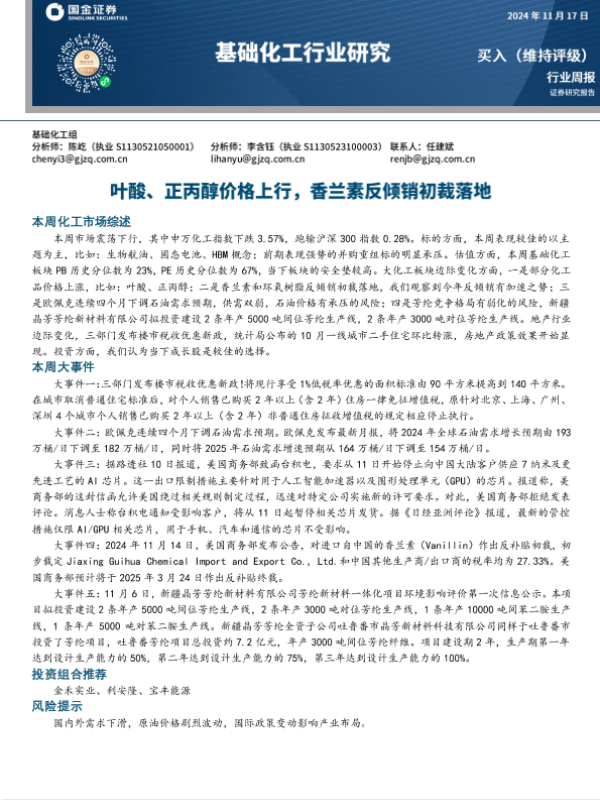 【国金证券】【20241117】基础化工行业研究:叶酸、正丙醇价格上行,香兰素反倾销初裁落地-20页 行业研究