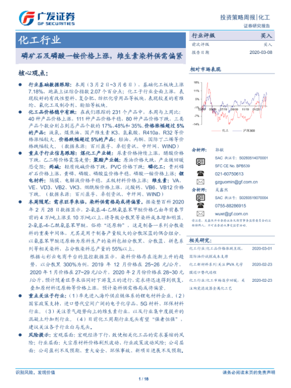 【广发证券】【20200308】20200308-广发证券-化工投资策略周报:磷矿石及磷酸一铵价格上涨,维生素染料供需偏紧-18页 行业研究