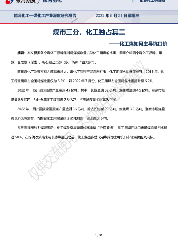 【银河期货】【20220831】能源化工_煤化工产业深度研究报告:化工煤如何主导坑口价,煤市三分,化工独占其二-32页 行业研究