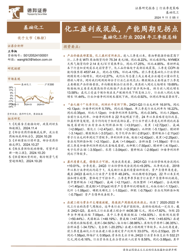 【德邦证券】【20241105】基础化工行业2024年三季报总结:化工盈利或筑底,产能周期见拐点-27页 行业研究