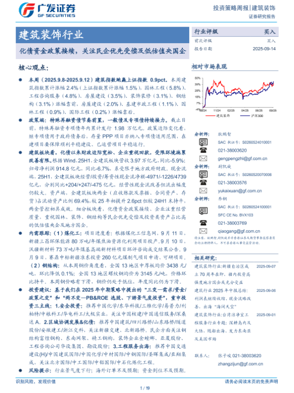 【广发证券】【202509】建筑装饰行业:化债资金政策接续,关注民企优先受偿及低估值央国企-19页 证券期货研究报告