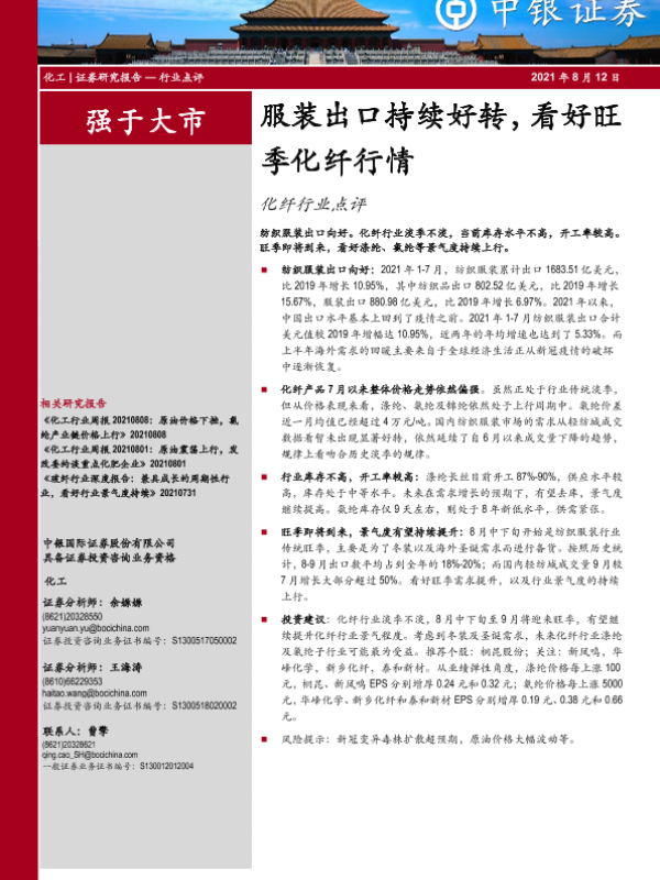 【中银证券】【20210812】20210812-中银证券-化纤行业点评:服装出口持续好转,看好旺季化纤行情-11页 行业研究