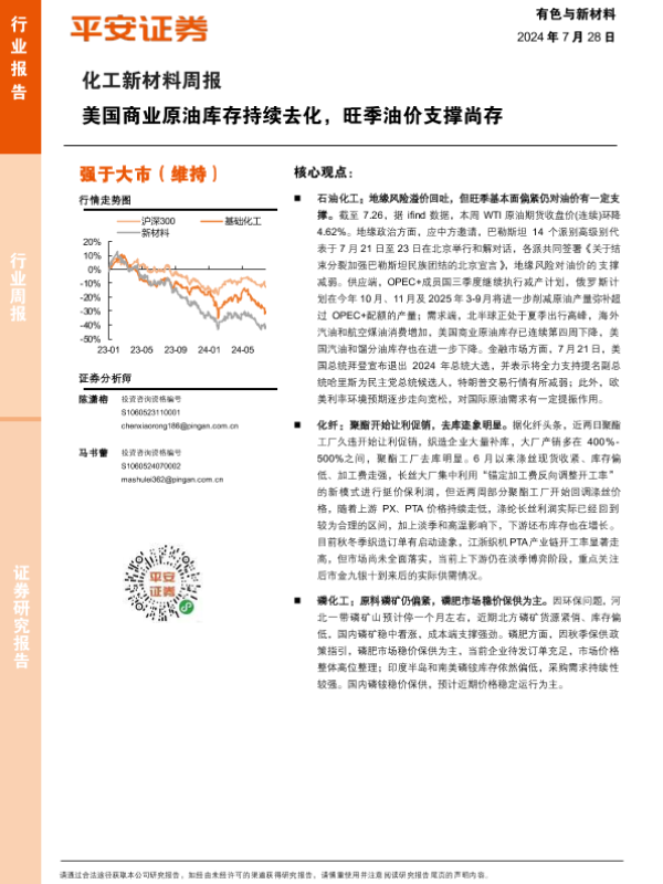 【平安证券】【20240728】20240728-平安证券-化工新材料行业周报:美国商业原油库存持续去化,旺季油价支撑尚存-15页 行业研究