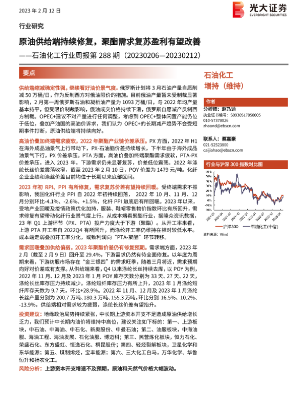【光大证券】【20230212】20230212-光大证券-石油化工行业周报第288期:原油供给端持续修复,聚酯需求复苏盈利有望改善-19页 行业研究