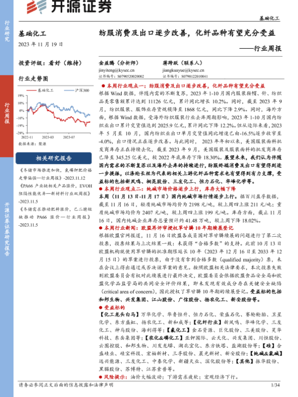 【开源证券】【20231119】基础化工行业周报:纺服消费及出口逐步改善,化纤品种有望充分受益-34页 行业研究