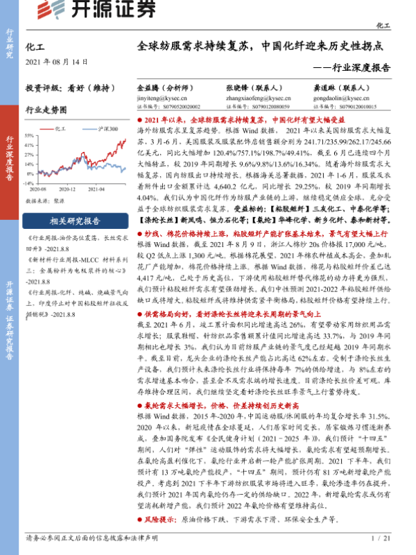【开源证券】【20210814】20210814-开源证券-化工行业深度报告:全球纺服需求持续复苏,中国化纤迎来历史性拐点-21页 行业研究