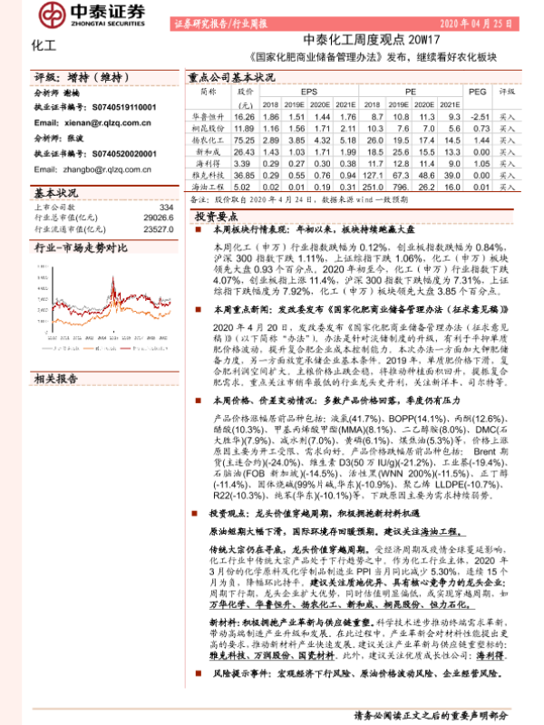 【中泰证券】【20200425】中泰化工周度观点20W17:《国家化肥商业储备管理办法》发布,继续看好农化板块-28页 行业研究