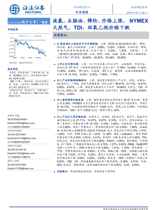 【海通证券】【20190109】20190109-海通证券-化工行业周报:液氯、石脑油、锦纶、价格上涨,NYMEX天然气、TDI、环氧乙烷价格下跌-18页 行业研究