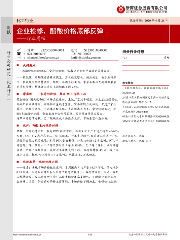 【浙商证券】【20200426】20200426-浙商证券-化工行业周报:企业检修,醋酸价格底部反弹-15页 行业研究