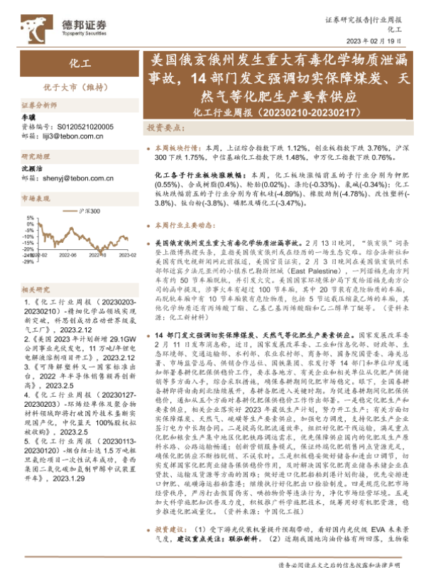 【德邦证券】【20230219】化工行业周报:美国俄亥俄州发生重大有毒化学物质泄漏事故,14部门发文强调切实保障煤炭、天然气等化肥生产要素供应-25页 行业研究