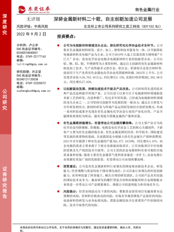 【东莞证券】【20220902】北交所上市公司系列研究之昆工科技:深耕金属新材料二十载,自主创新加速公司发展-22页 行业研究