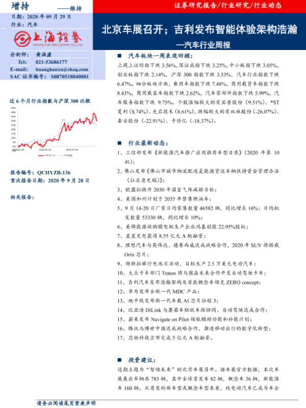 【上海证券】【20200928】20200929-上海证券-汽车行业周报:北京车展召开;吉利发布智能体验架构浩瀚-14页 行业研究