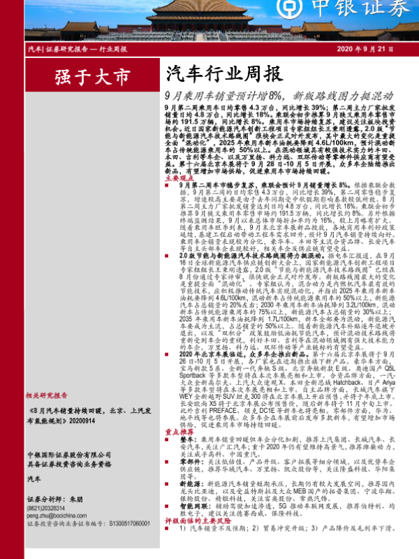 【中银证券】【20200921】20200921-中银证券-汽车行业周报:9月乘用车销量预计增8%,新版路线图力挺混动-15页 行业研究