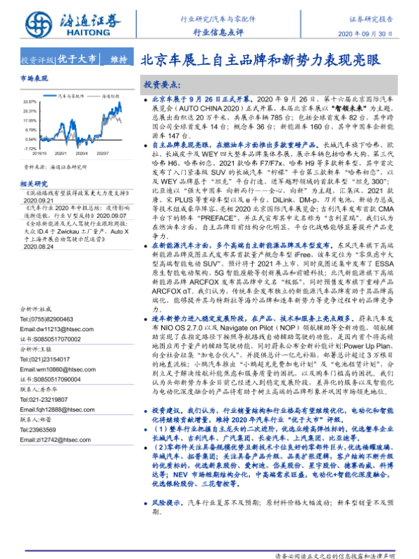 【海通证券】【20200930】汽车与零配件行业信息点评:北京车展上自主品牌和新势力表现亮眼-4页 行业研究