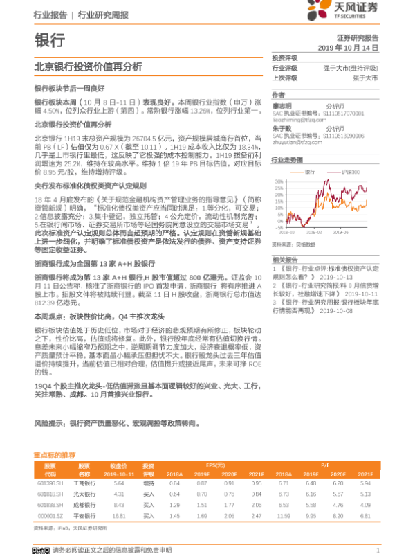 【天风证券】【20191014】银行行业研究周报:北京银行投资价值再分析-20页 行业研究