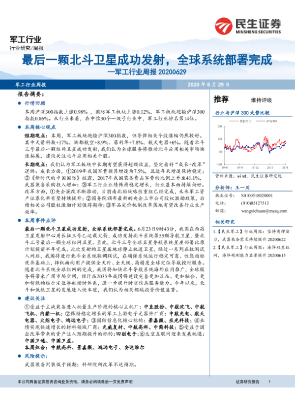 【民生证券】【20200629】20200629-民生证券-军工行业周报:最后一颗北斗卫星成功发射,全球系统部署完成-40页 行业研究