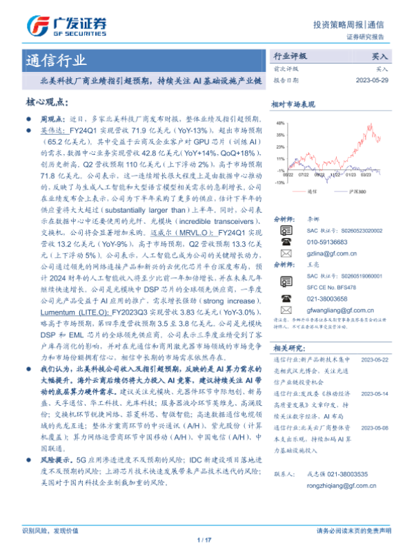 【广发证券】【20230529】20230529-广发证券-通信行业投资策略周报:北美科技厂商业绩指引超预期,持续关注AI基础设施产业链-17页 行业研究