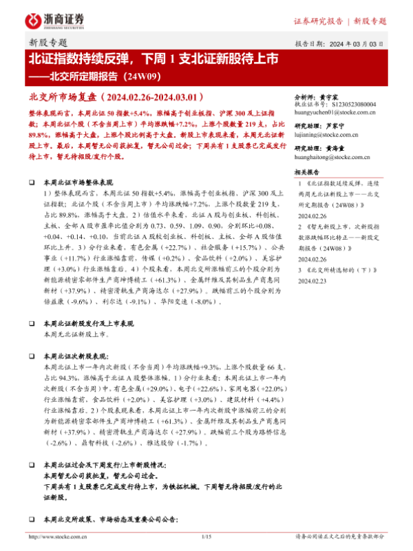 【浙商证券】【20240303】北交所定期报告(24W09):北证指数持续反弹,下周1支北证新股待上市-15页 行业研究