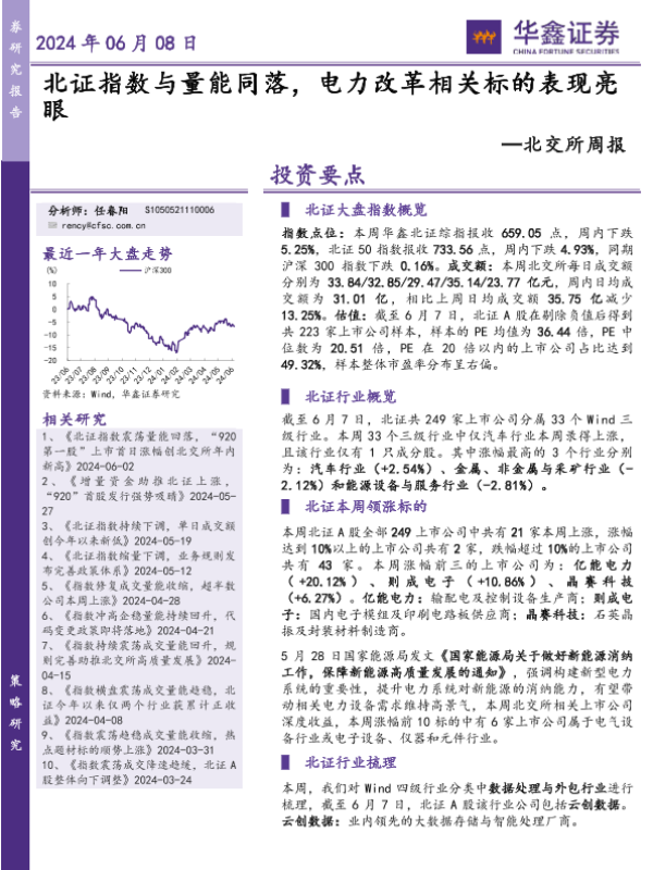 【华鑫证券】【20240608】北交所:北证指数与量能同落,电力改革相关标的表现亮眼-15页 行业研究