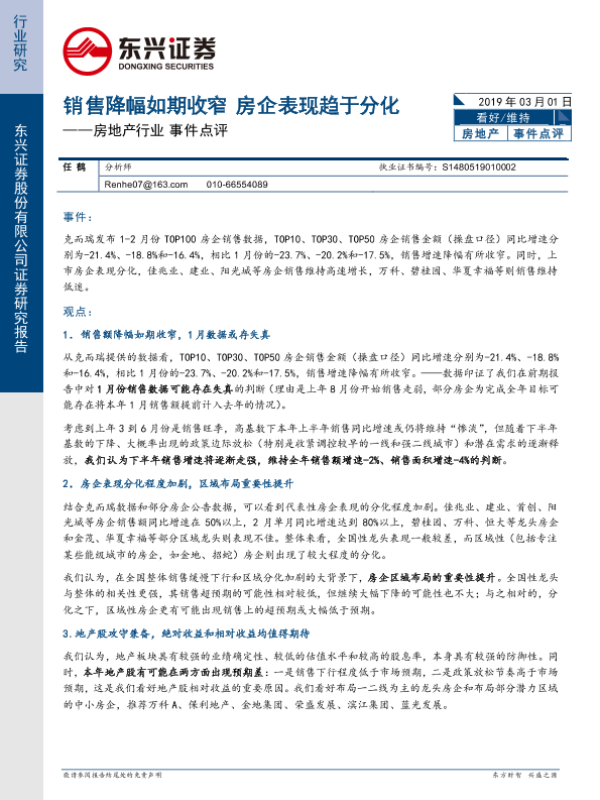 【东兴证券】【20190301】房地产行业事件点评:销售降幅如期收窄 房企表现趋于分化-3页 行业研究
