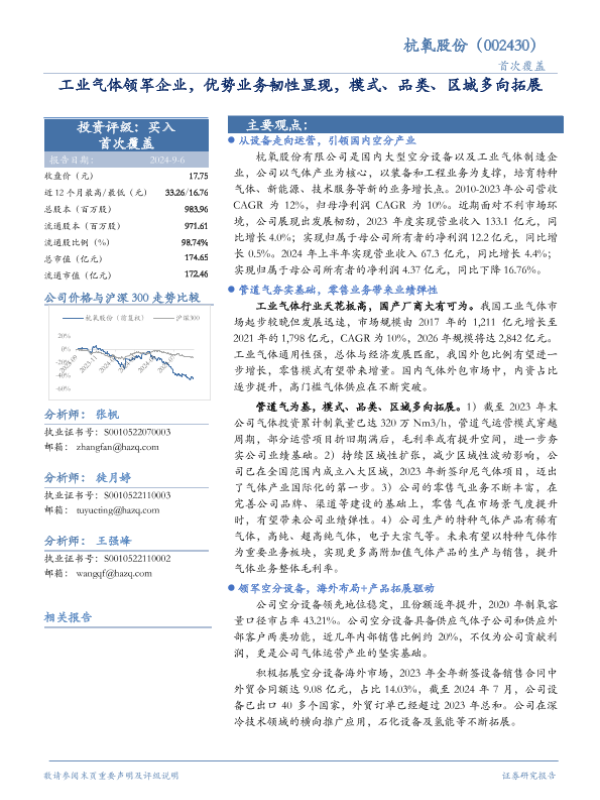【华安证券】【20240906】杭氧股份工业气体领军企业,优势业务韧性显现,模式、品类、区域多向拓展-30页 证券期货研究报告
