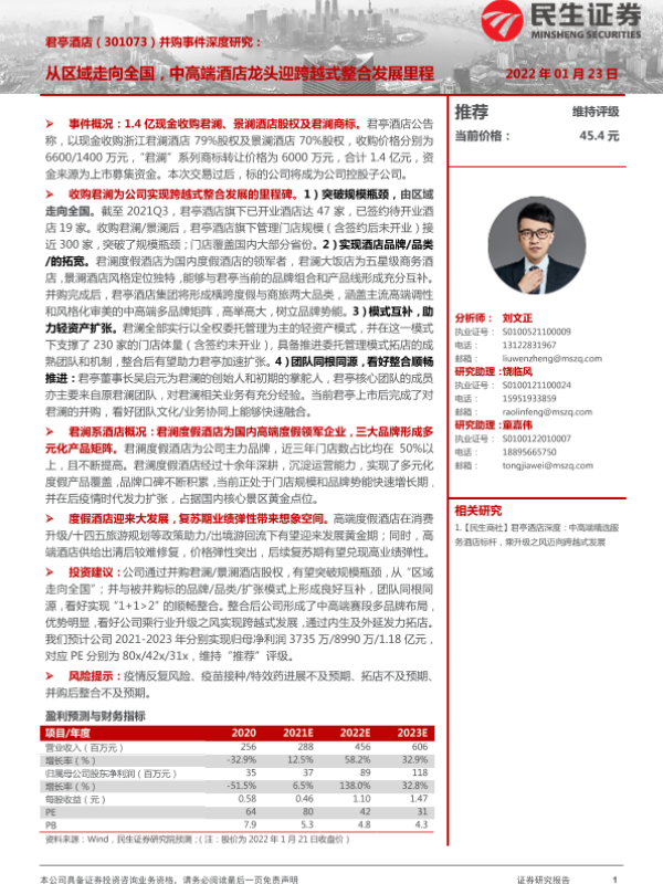 【民生证券】【20220123】君亭酒店(301073)并购事件深度研究:从区域走向全国,中高端酒店龙头迎跨越式整合发展里程-27页 行业研究