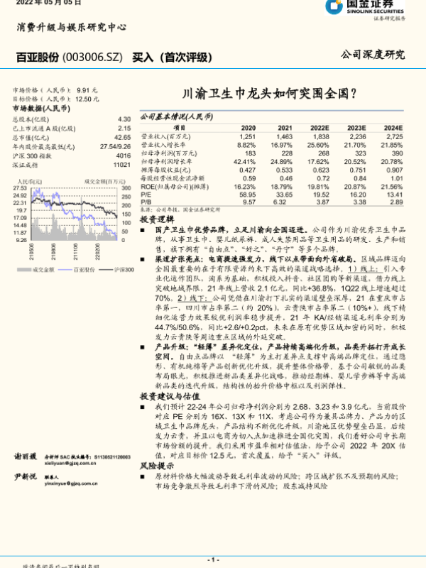 【国金证券】【20220505】国金证券-百亚股份-003006.SZ-川渝卫生巾龙头如何突围全国?-25页 行业研究