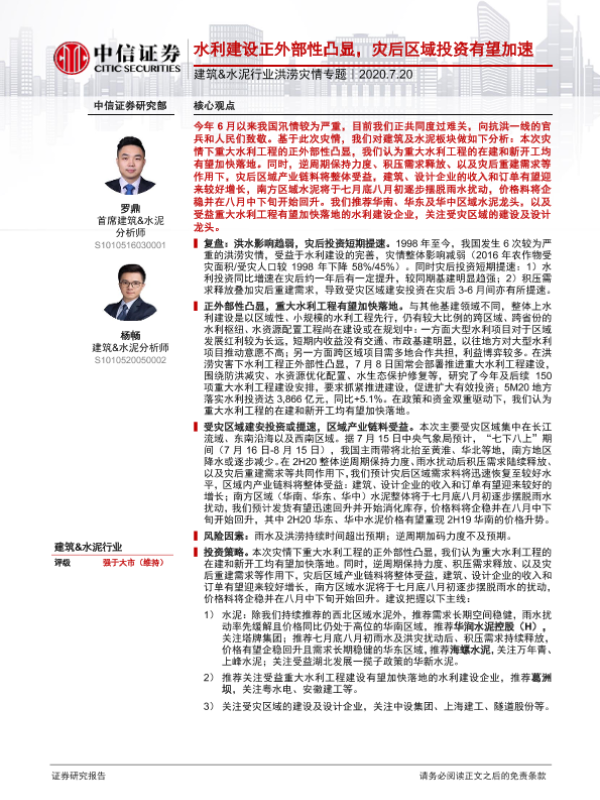 【中信证券】【20200720】建筑&水泥行业洪涝灾情专题:水利建设正外部性凸显,灾后区域投资有望加速-22页 行业研究
