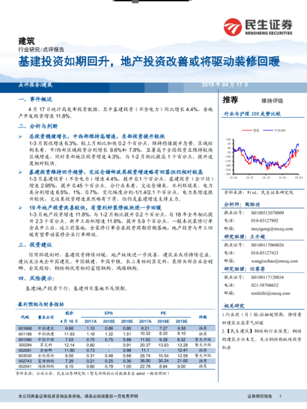 【民生证券】【20190417】建筑点评报告:基建投资如期回升,地产投资改善或将驱动装修回暖-3页 行业研究