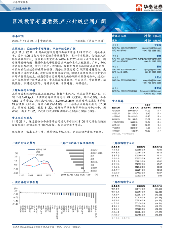 【华泰证券】【20241124】工业基础材料行业周报:区域投资有望增强,产业升级空间广阔-13页 行业研究